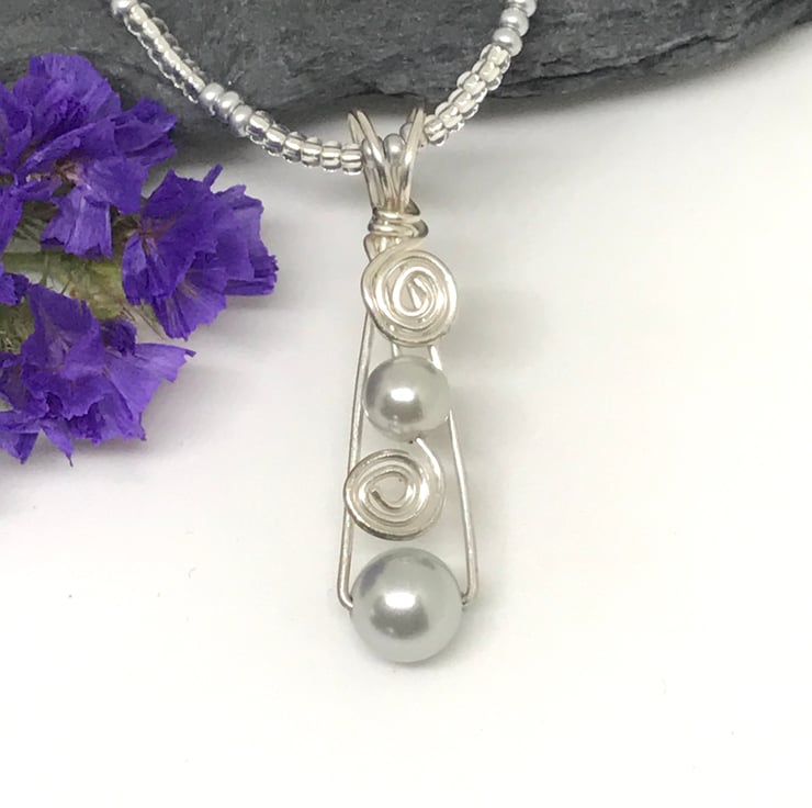 I have created this elegant pendant with sterling silver wire and a silver grey shell pearl beads, using wire wrapping techniques. The pendant is presented on a silver grey and silver lined seed bead necklace with sterling silver lobster claw clasp. These tiny seed beads compliment the grey pearls beautifully.