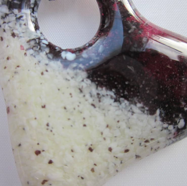 It is a stunning ornament, with transparent cranberry frit cast beside vanilla and encased in clear glass. The pink has reacted with the sulphur in the vanilla glass making a truly unique reaction. It is approximately 5cm across. A beautiful piece of statement jewellery and one of a kind. Ideal as a present to a loved one.