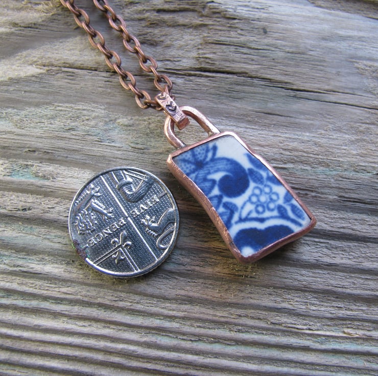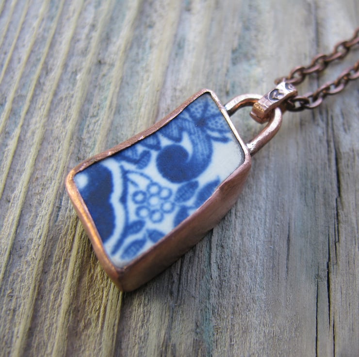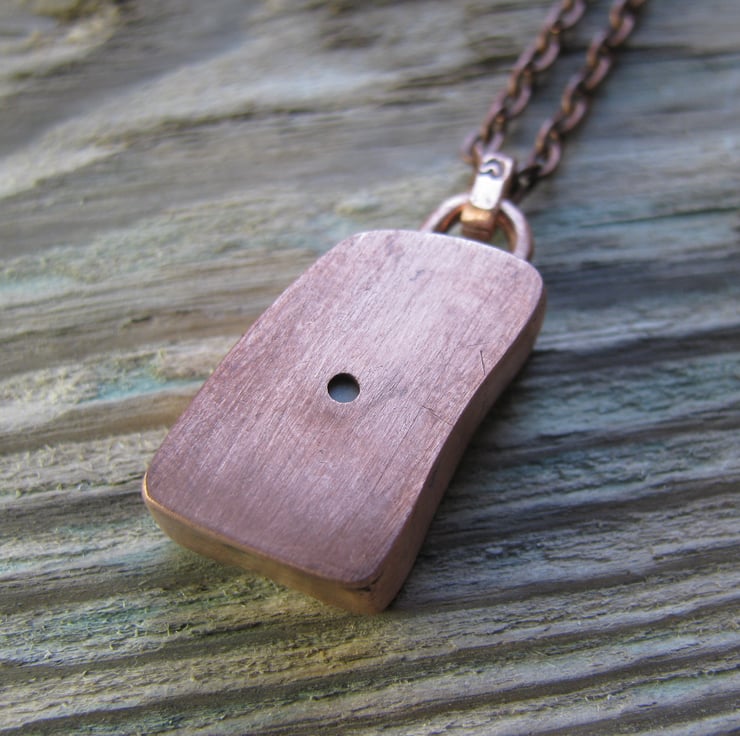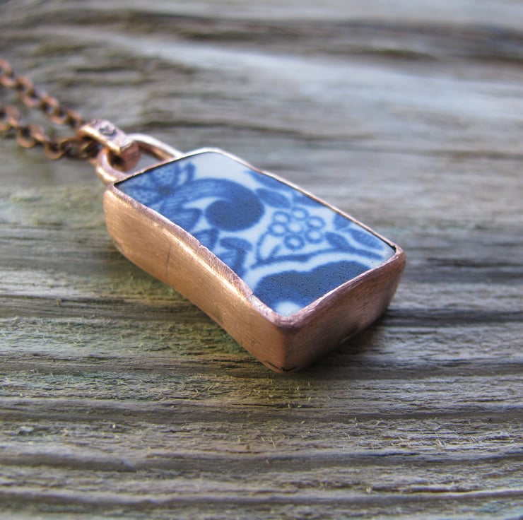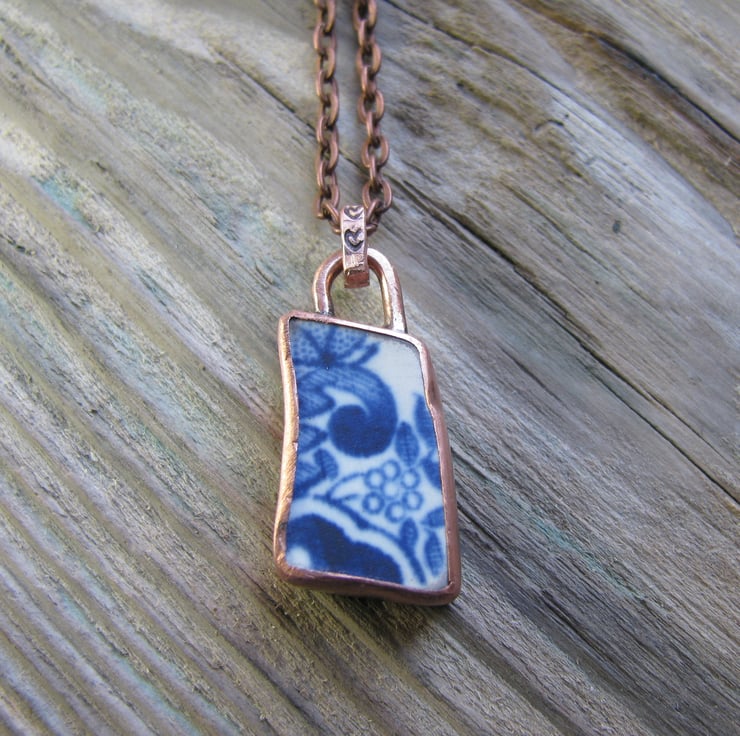 For this pendant I have used a piece of pottery ( 6 mm thick) which has been tumbled to smooth off the edges (this is not sea pottery) . I have made the bezel setting from different thicknesses of copper sheet. It has been soldered and filed smooth and holds the pottery in place snuggly. The small bail has tiny hearts stamped onto it. The overall appearance is of aged copper as is the copper tone chain 18" in length.