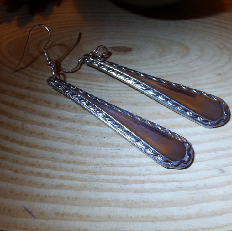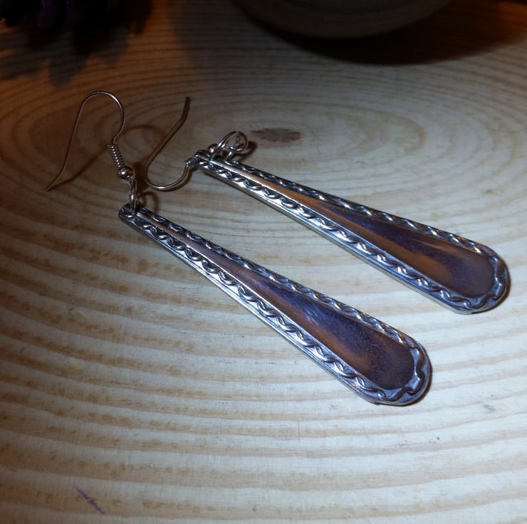 These lovely earrings have been handmade from an old pair of silver plated sugar tongs. The bowls of the sugar tong has been removed, and the handle have been cut around. Holes have then been drilled for the silver plated ear wires.