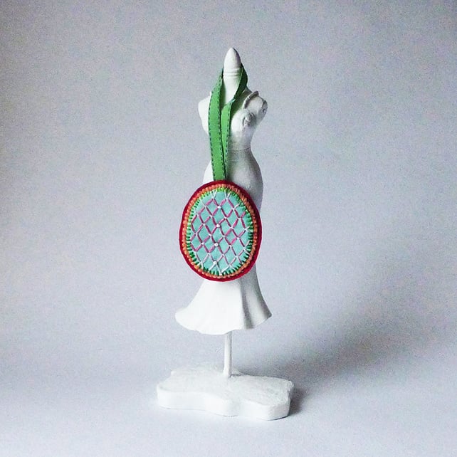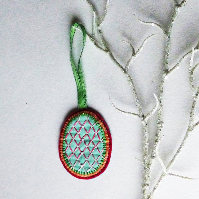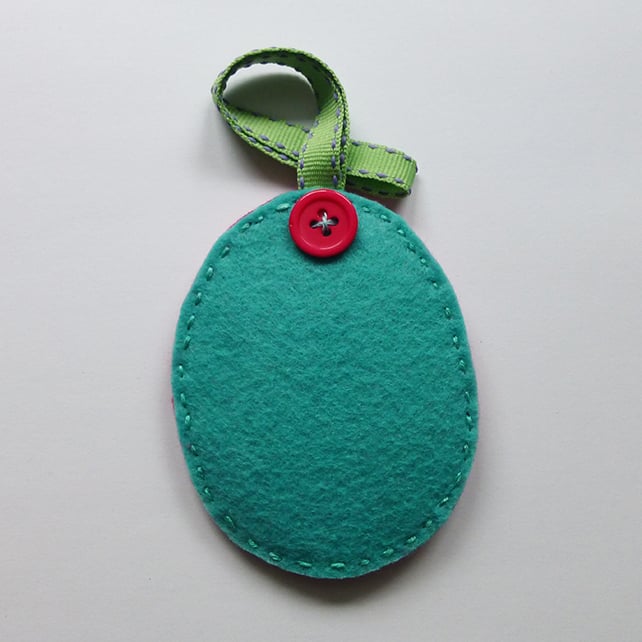It is hand sewn in a pleasing combination of colours – turquoise, orange, hot pink, green, pink and white and is topped off with a colourful green hanging ribbon, with a hot pink button detail on its reverse. Lovely gift idea. Great for an Easter gift.