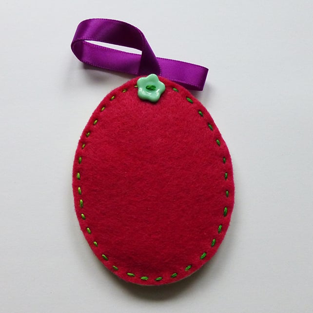 It is hand sewn in a pleasing combination of colours – pink, white, yellow, green and silver and is topped off with a colourful purple hanging ribbon, with a green flower button detail on its reverse.