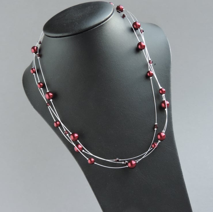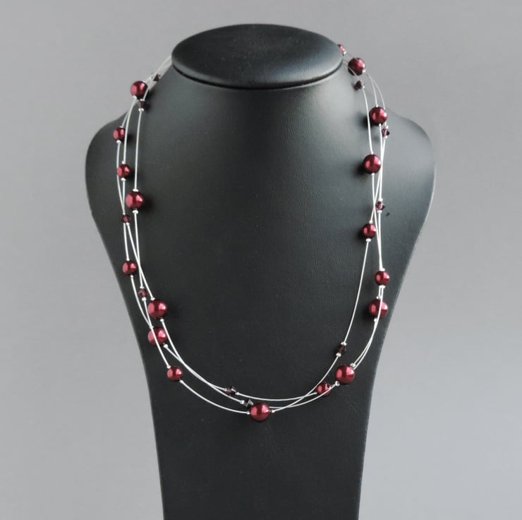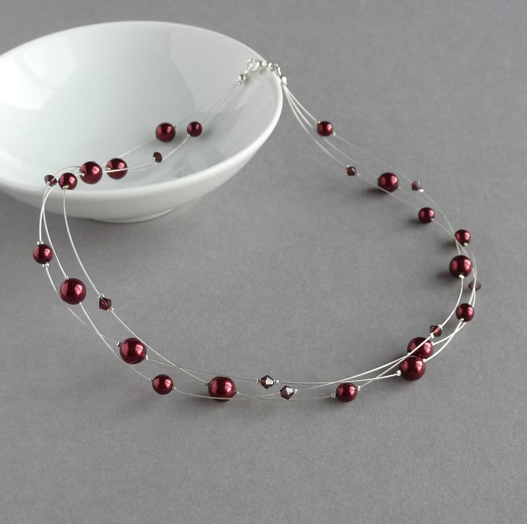 Burgundy Floating Pearl Necklace - Claret Red Bridesmaids - Wedding Jewellery