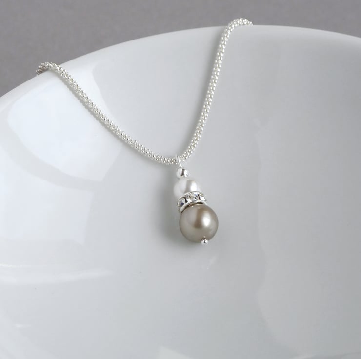 A single, champagne pearl sits in a crystallized belt above a white glass pearl. This taupe pearl and crystal drop hangs from a Sterling silver corb chain. The lustre of the pearls combined with the sparkle of the crystals makes this necklace the ideal gift for bridesmaids in a beige coloured wedding.