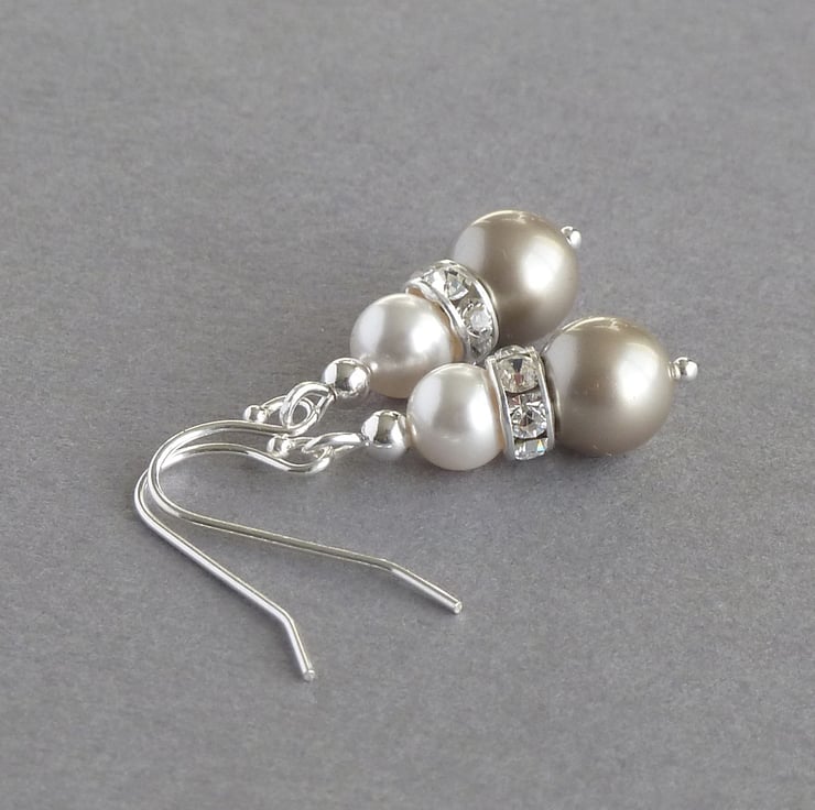 I have teamed champagne and white glass pearls and shimmering crystal bands to create these coffee pearl and crystal earrings. These pearl drop earrings would add a touch of sparkle to a soft gold themed wedding.