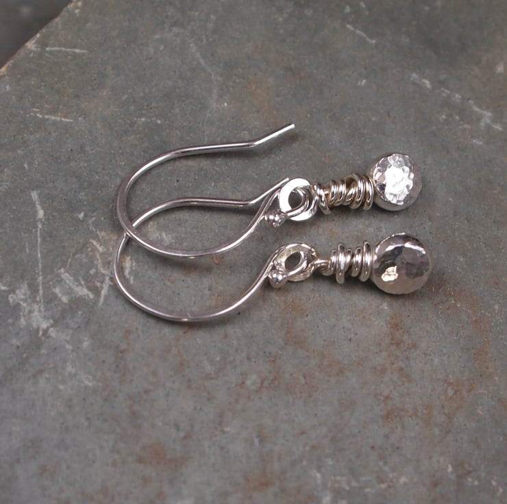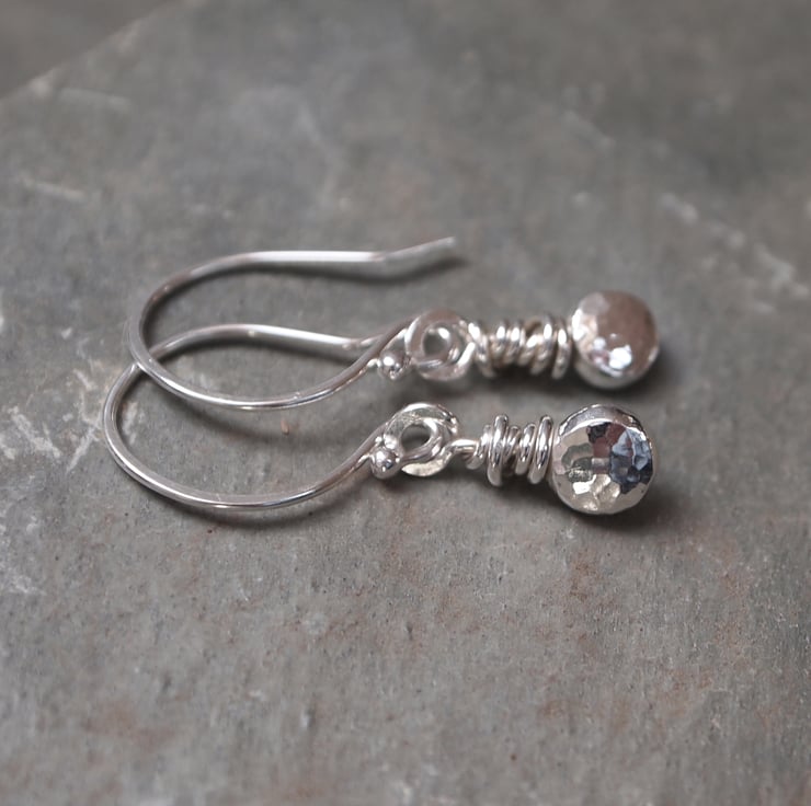 I recycle all my offcuts of silver and like to make these little hammered silver pebbles to incorporate into my designs. I also have stud earrings in stock that look great with these drop earrings in a row of piercings.