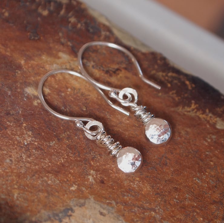 Little pebbles of recycled sterling silver hang by a twist from handmade ear wires to form these great little everyday earrings. The pebbles have been hammered to add texture and sparkle and the earrings have been burnished to give them a bright shine.