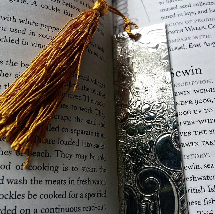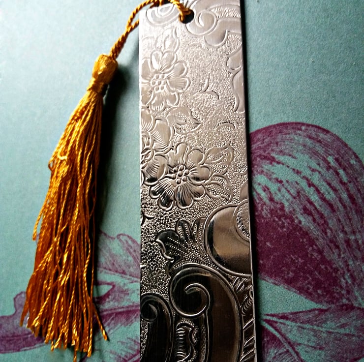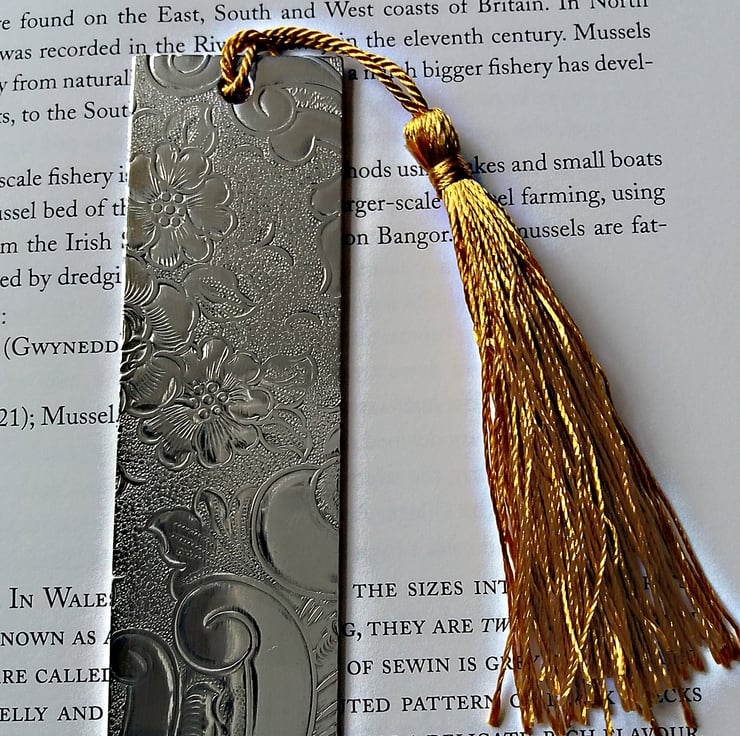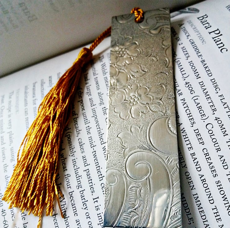 This is a handmade pewter bookmark which was made in Sheffield,England.The bookmark features a decorative swirly pattern with floral details which was achieved by rolling pewter with Victorian patterned tools which were also made in Sheffield originally for trays and salvers.The bookmark is fitted with a silk tassel