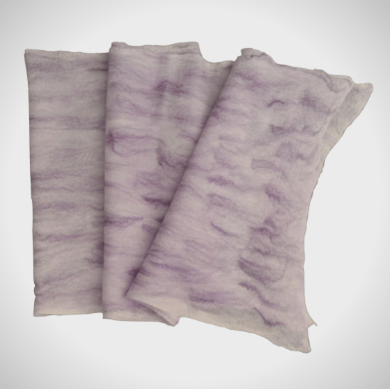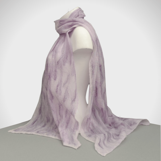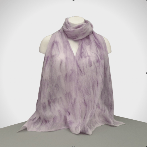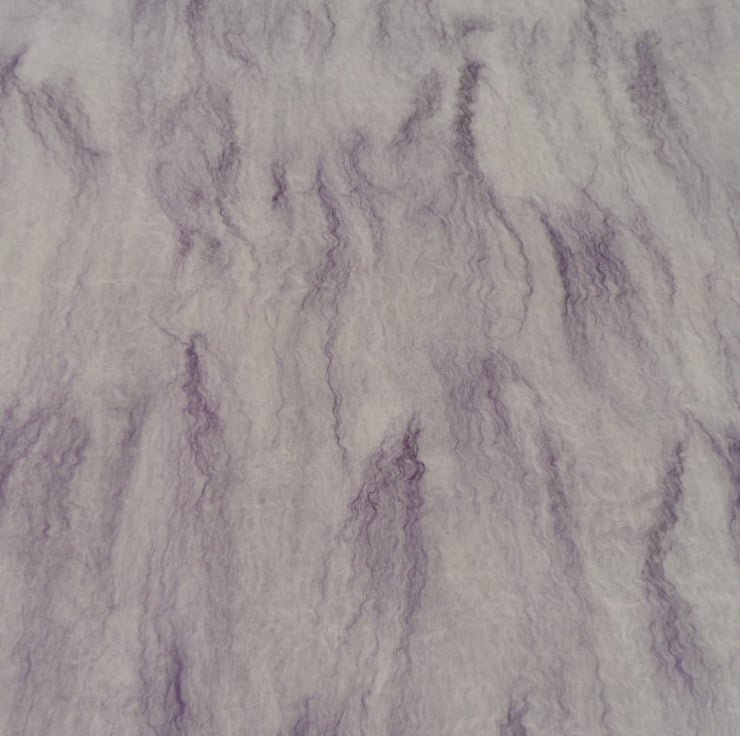 A longer length nuno felted scarf made using very fine layers of natural white (unbleached) merino wool on a pale lilac silk chiffon scarf. Fibres of dark purple silk have been added to one side before felting to add a lustrous decorative effect. The reverse side has been felted but left plain.