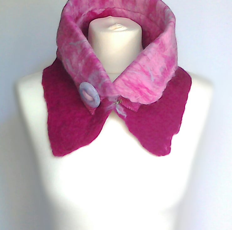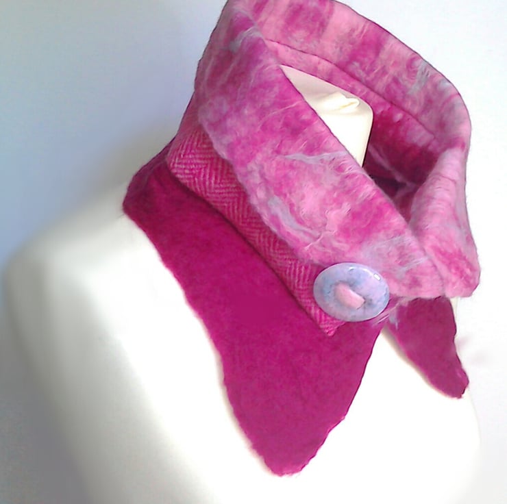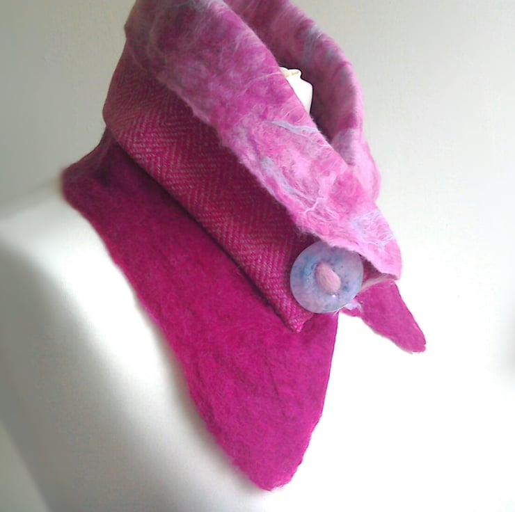 This unusual collar or scarf - shall we call it 'scollar'? - is made from soft merino wool, hand felted by me, with a band of fabulous Harris Tweed around the middle. The colour combination in the felt is so warm and pretty. The different shades of pink and blues blend beautifully and complement the pink and cerise herringbone of the Harris Tweed. A gorgeous handmade glass button from fellow Folksy seller Heavenly Anarchist adds a very stylish finishing touch.