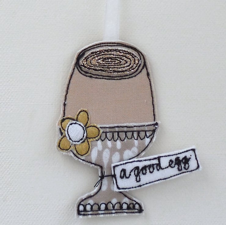 Fabric eggcup holds a beige fabric egg with a glitter fabric yolk, a ribbon to hang and a sewn fabric label, 'a good egg'!