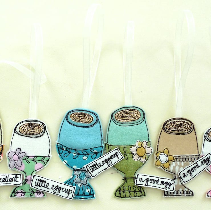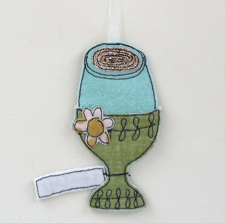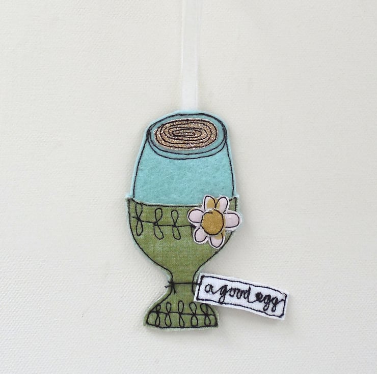 Fabric eggcup holds a mint coloured felt fabric egg with a glitter fabric yolk, a ribbon to hang and a sewn fabric label, 'a good egg'!