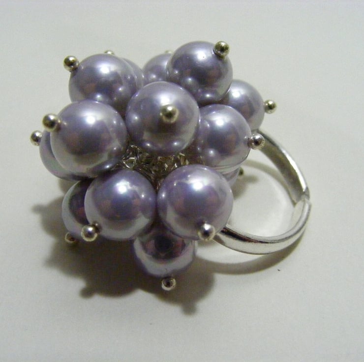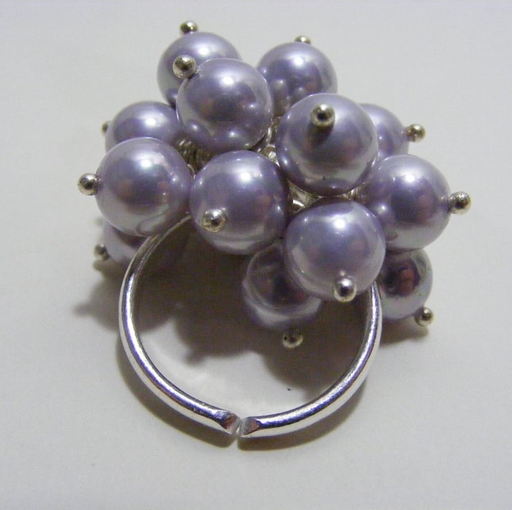 I have made this adjustable ring with a silver plated adjustable ring base and wire wrapped 8 mm lavender shell pearl rounds onto the 3 loops. Headpins are silver plated.