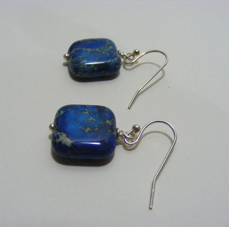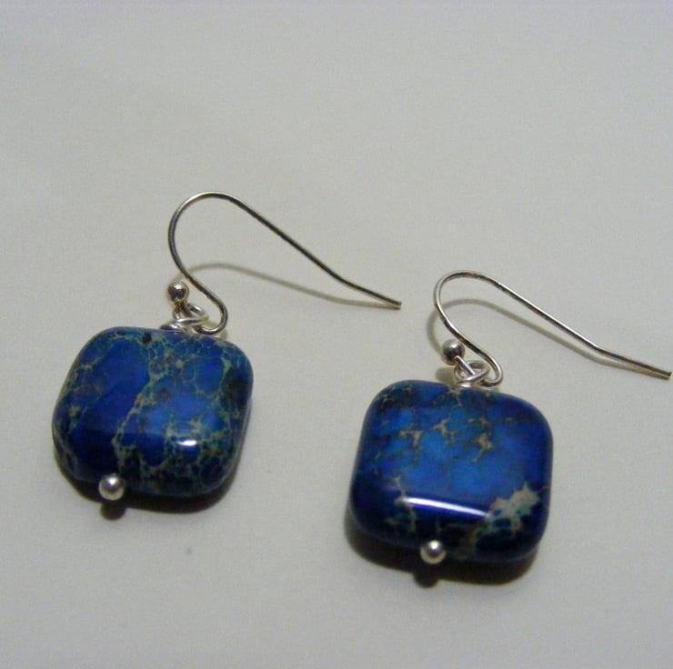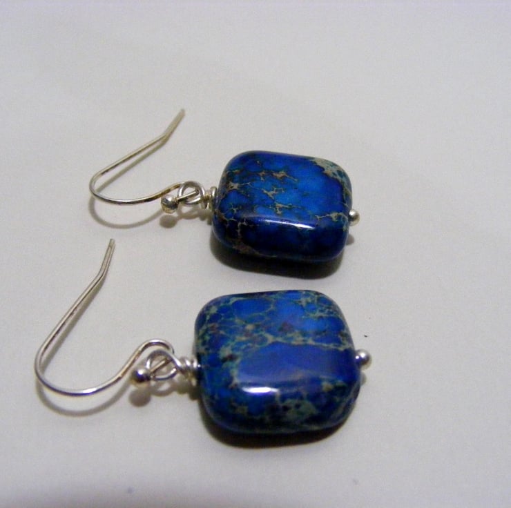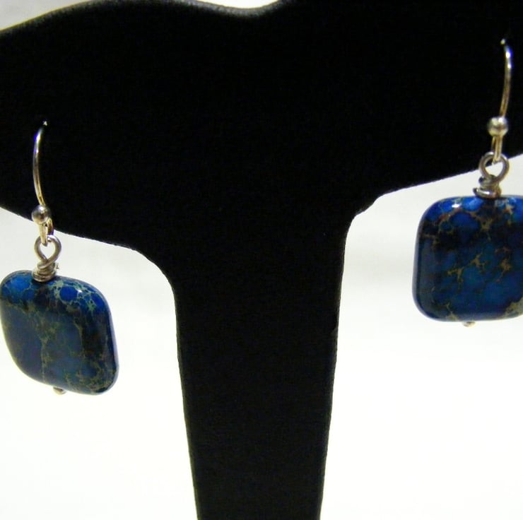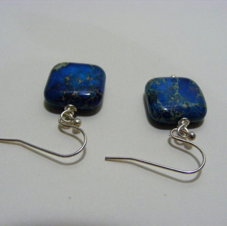 I have made these semi precious gemstone earrings by threading 14 mm blue impression jasper squares onto silver plated ball headpins and wrapped remaining wire. Ear wires are silver plated.