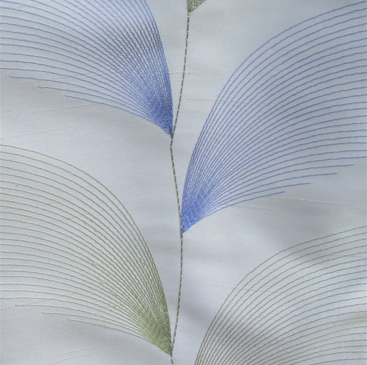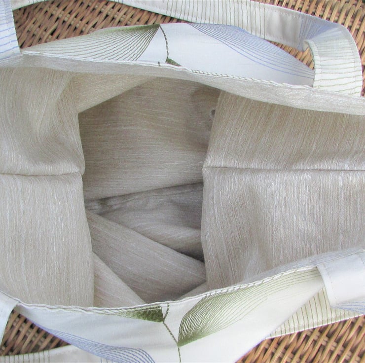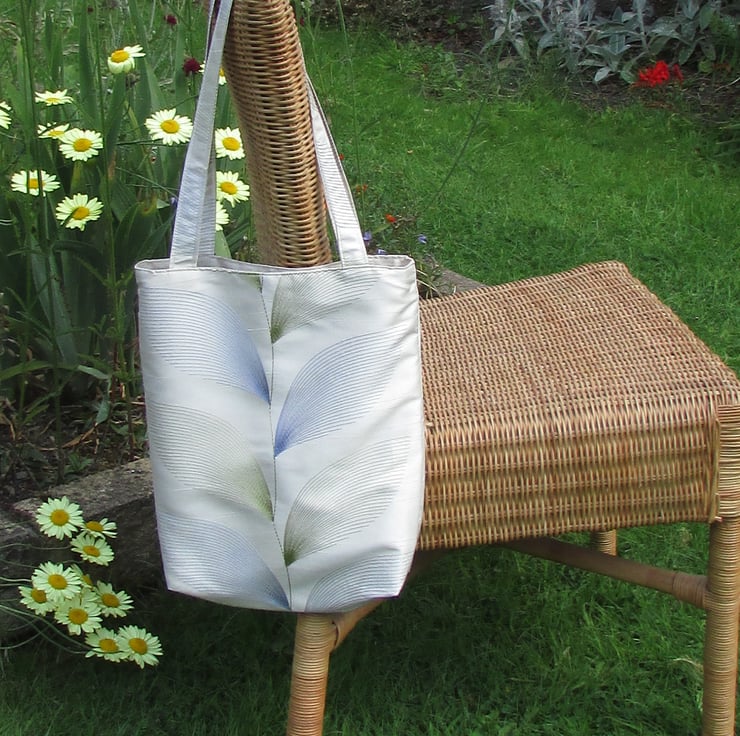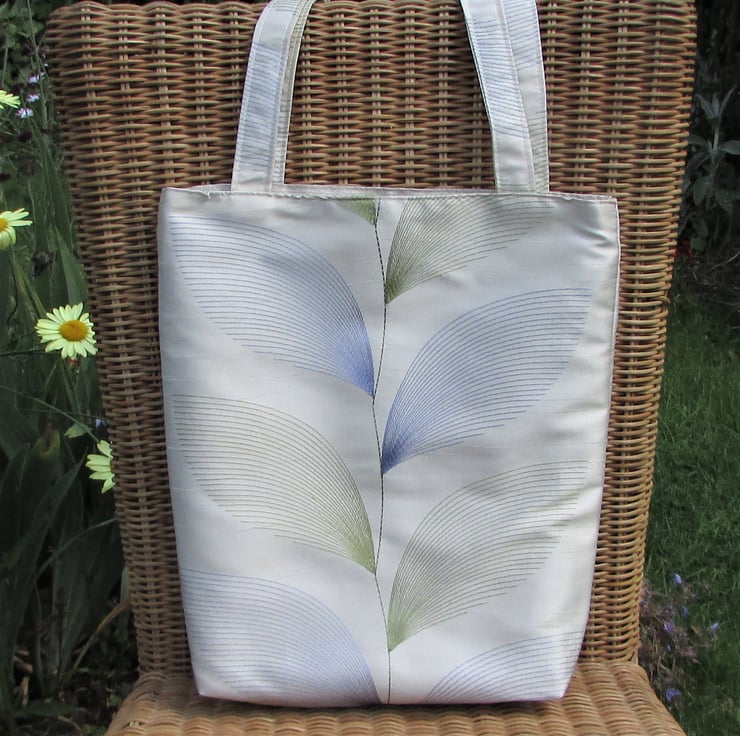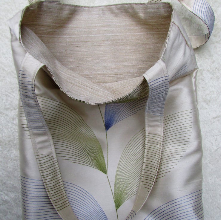A lovely tote bag in a beautiful ivory satin fabric with an embroidered pattern of leaves in vivid blue and sage green. The pattern catches and reflects the light giving a really striking effect that is not easily captured in the photos. The bag is fully lined with a pale beige and cream fabric with a striped pattern in the weave.