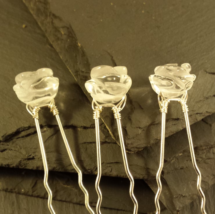 These three hair pins are simply gorgeous. Clear quartz carved roses have been wired onto silver hair pins, with silver-plated wire. A perfect accessory for any bride, bridesmaid or prom princess. Add that bit of sparkle to any hair-do. The pins are 6.5 cm long, the roses are 1.2cm wide and 1cm tall.