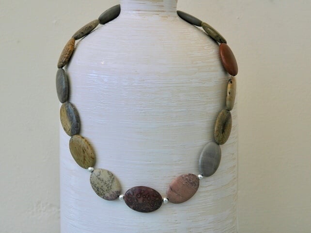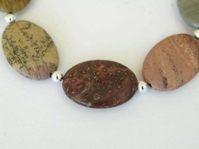 This beautiful silver and gemstone necklace features chunky oval beads of picture jasper in subtle earthy shades of grey, yellow ochre, pink and brick red. It is a very versatile piece of jewellery - you could wear it anywhere. Each stone has its own unique pattern, sometimes resembling a landscape, and the surface has been polished to a soft sheen. I have inserted four round sterling silver beads at the front to add highlights to the design. The beads are threaded on strong jeweller's wire. The figure-of-eight clasp and rings are hand made from sterling silver and I have added a 3 inch (8cm) extension chain so you can vary the length. This item will be packaged in a smart gift box or organza bag and sent by Royal Mail second class post in the UK.