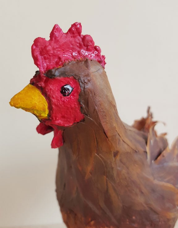 The sculpture has then been hand painted using acrylics and a high gloss finish for the eyes. The chicken is free standing on a solid surface.