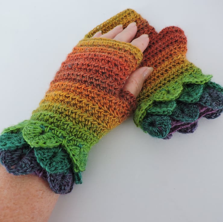 Pretty crochet adults wrist warmers, fingerless mitts, which I made with an acrylic and wool graduated yarn.