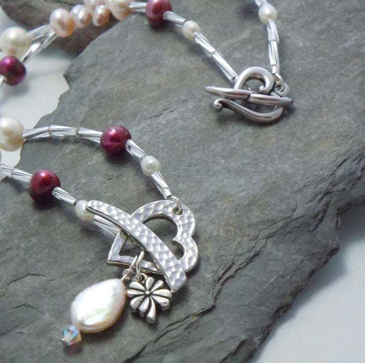 A delicate silver plated necklace with mixed colours of freshwater pearls interspersed with bugle beads & finished with a silver plated TierraCast heart toggle clasp. Also an added focal drop pendant with a TierraCast silver plated toggle clasp & a four leaf clover charm & a lovely mother of pearl oval bead & a Swarovski crystal bead. This would be ideal for a wedding for the bride or as a gift for the bridesmaid. There is a similar bracelet to this necklace.