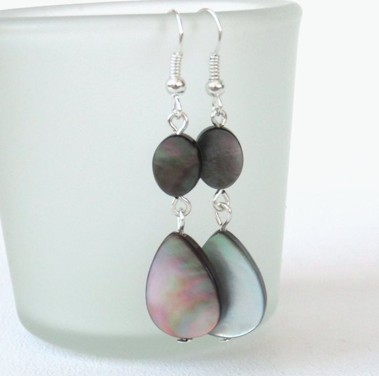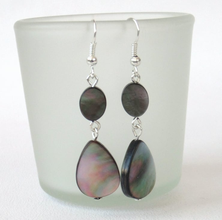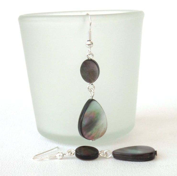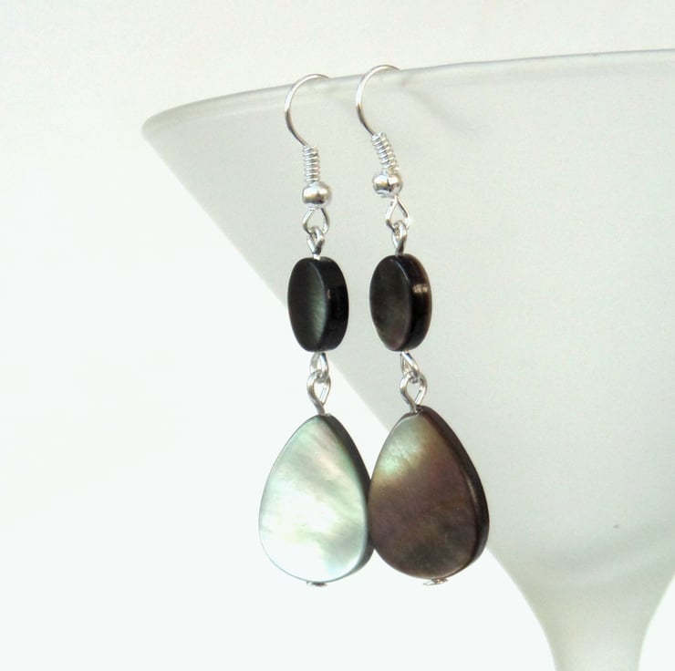 Two pieces of pretty black shell hangs from silver plated earwires to make these unusual earrings.