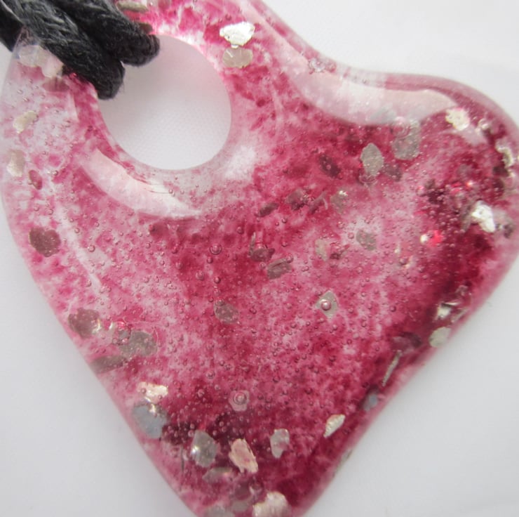 It is a beautiful mottled dark pink with scattered silver mica glitter enclosed, and is glossy with surface mica creating occasional texture. It is approximately 5cm across. A beautiful piece of statement jewellery and one of a kind. Ideal as a present to a loved one.