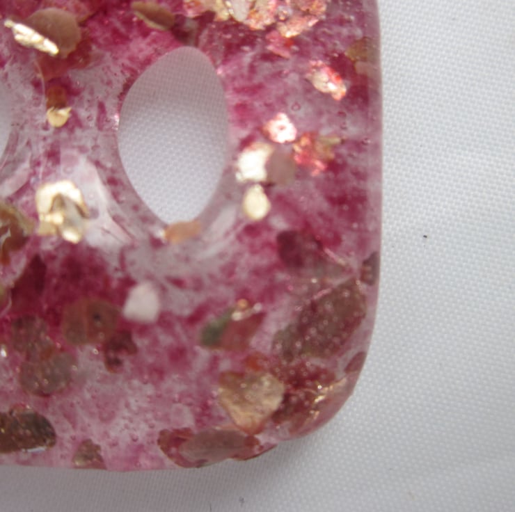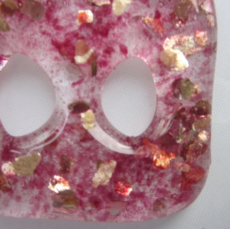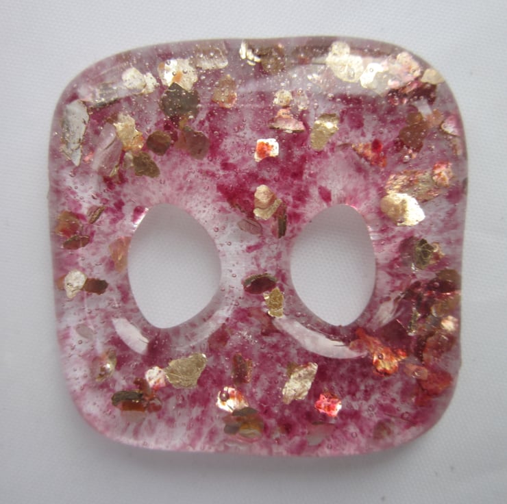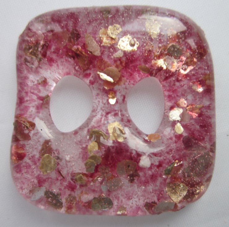 These buttons are a beautiful mottled dark pink with scattered gold mica glitter enclosed, and are glossy with surface mica creating occasional texture. They are approximately 4cm across. They will be perfect to fasten a bag or hand knit cardigan.