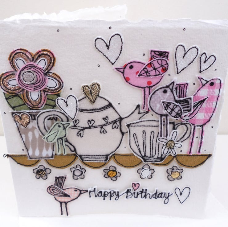 A freehand machine embroidered teapot, cup, flowerpot and birdies are surrounded by hearts and flowers, with a scolloped imaginary shelf and a sewn 'happy birthday'.