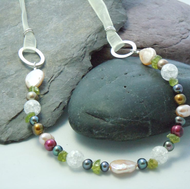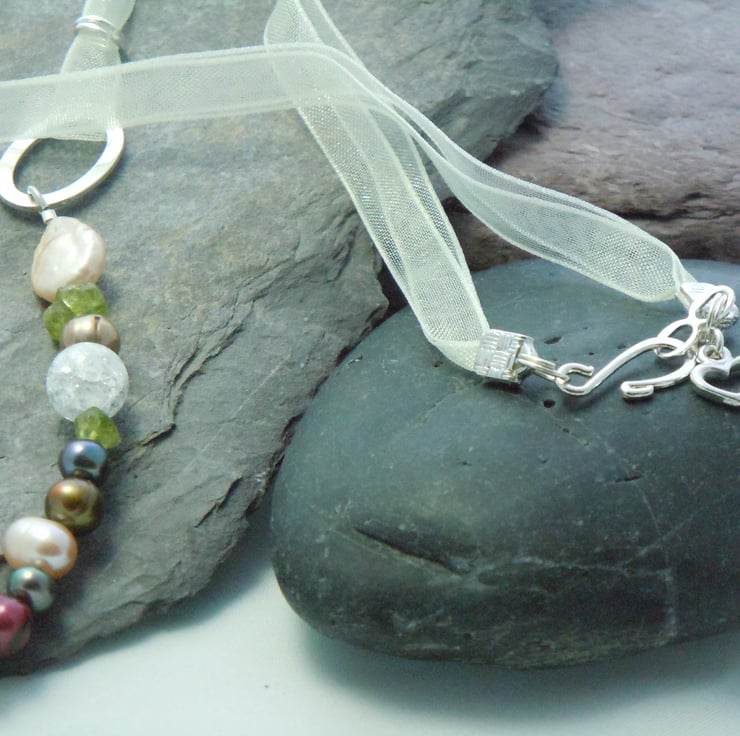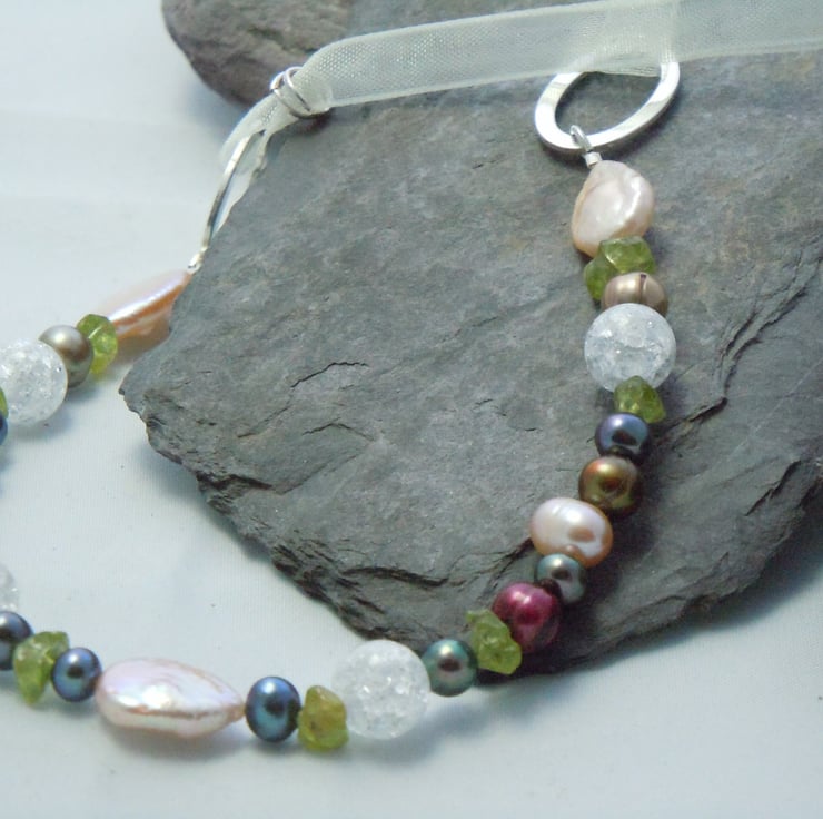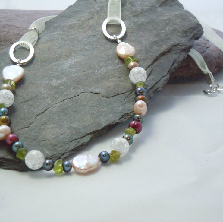 A lovely selection of coloured freshwater pearls, Peridot chips, mother of pearl beads & crackled quartz beads finished with silver plate oval connectors & pale green ribbon with a silver plate clasp & TierraCast heart charm. A lovely summery assortment of beads, light & airy with a romantic feel, perfect as a gift for a Wedding, Mother's Day, Valentines day, birthday or Christmas. There is a similar bracelet. Pearl is a June birthstone. Peridot is a August birthstone.