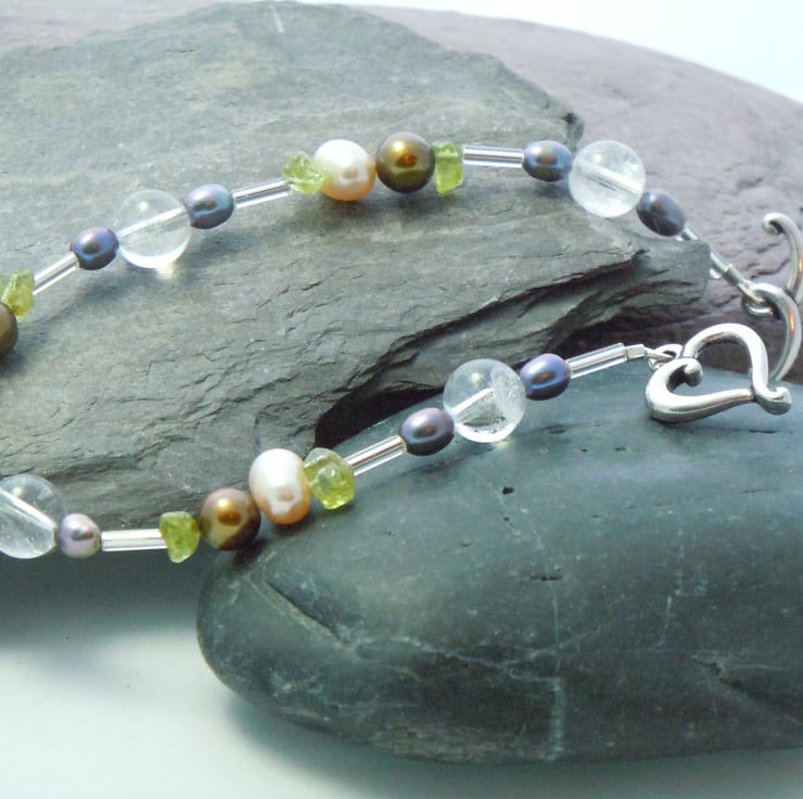 Who can resist pearls, a bracelet for all seasons as a gift on Valentines day, birthday, Christmas or as a gift for a loved one in your life. Peridot was believed in ancient times to keep away evil spirits so is a protective stone. Quartz has been prized for millennia & the Native Americans call it the brain cells of Grandmother Earth. It's said to amplify energy by absorbing, storing, releasing, and regulating it. It's also said to aid concentration and memory. Physically, clear crystals are claimed to help stimulate the immune system and balance out your entire body.