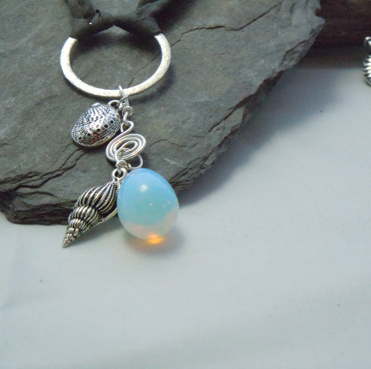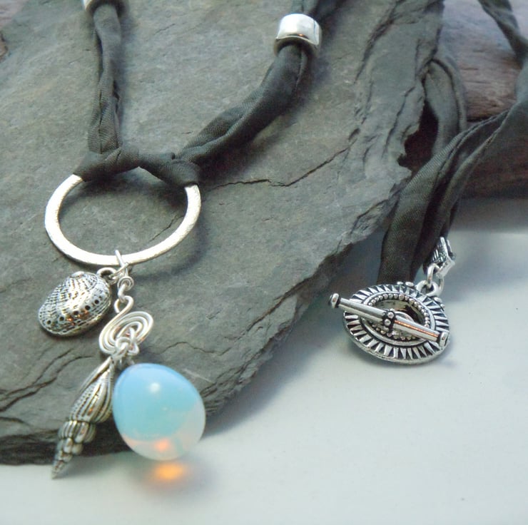 A necklace pendant with silver plated ring & a wirework celtic spiral, TierraCast shell charms & a gorgeous translucent Opalite teardop bead attached. A dark grey silk ribbon & silver plate chunky beads is attached to the ring & finished with a TierraCast toggle clasp.