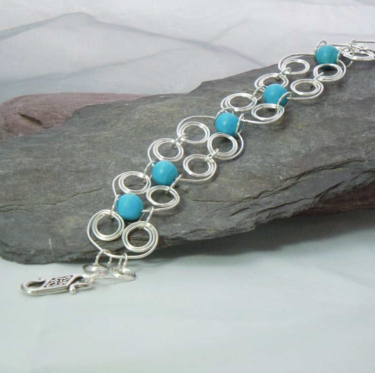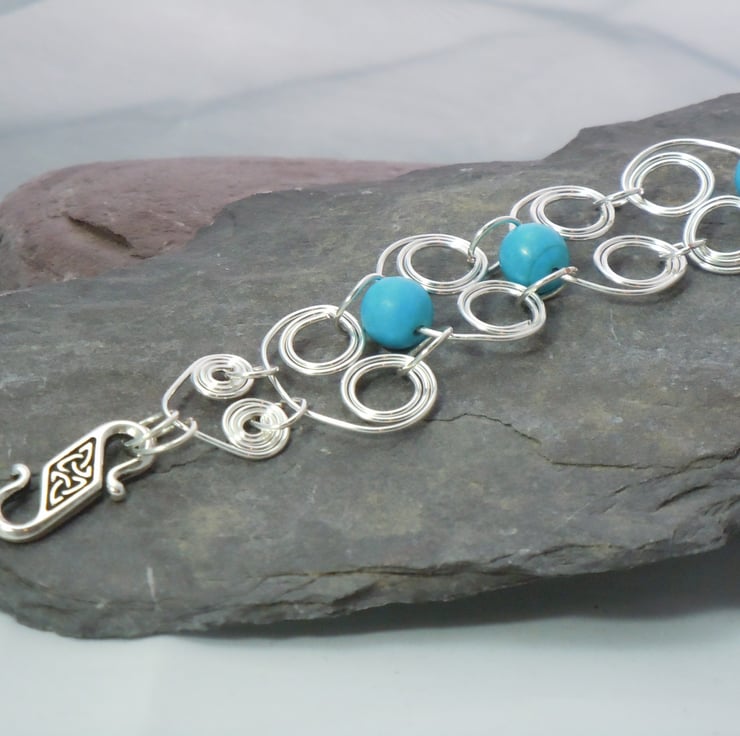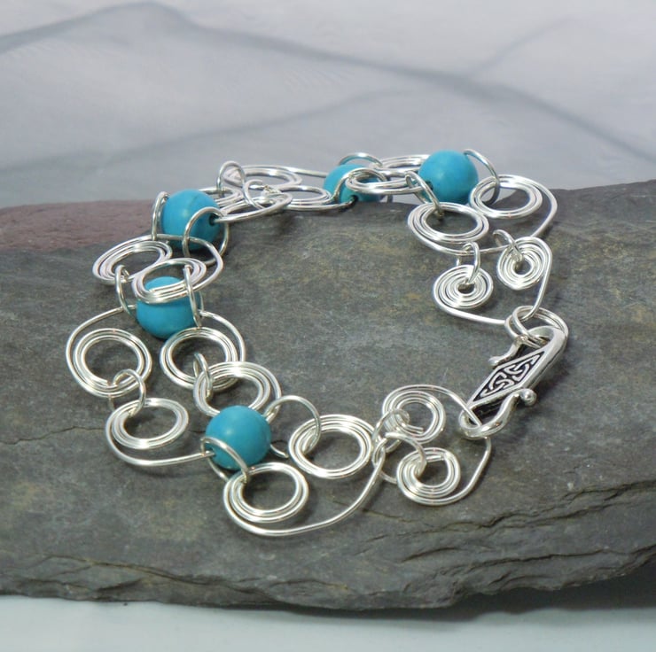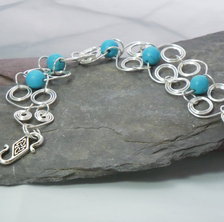 A delicate handcrafted Celtic silver plated wirework bracelet with turquoise beads & finished with a silver plated Celtic Tierracast S clasp.