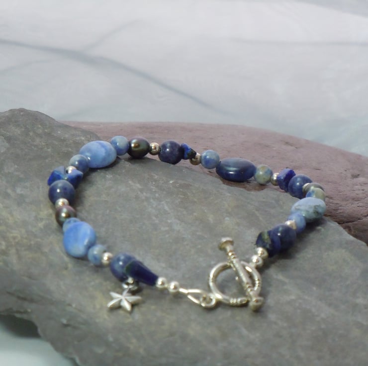 The lovely blue tones of Sodalite, Lapis Lazuli chips, & freshwater Pearl beads finished with a silver plated toggle clasp & a Tierracast star charm