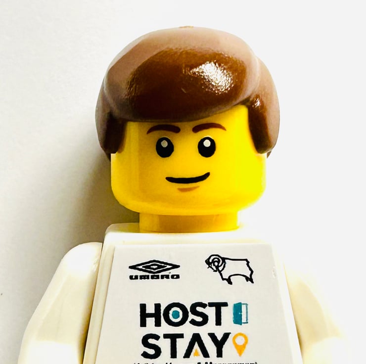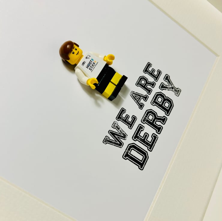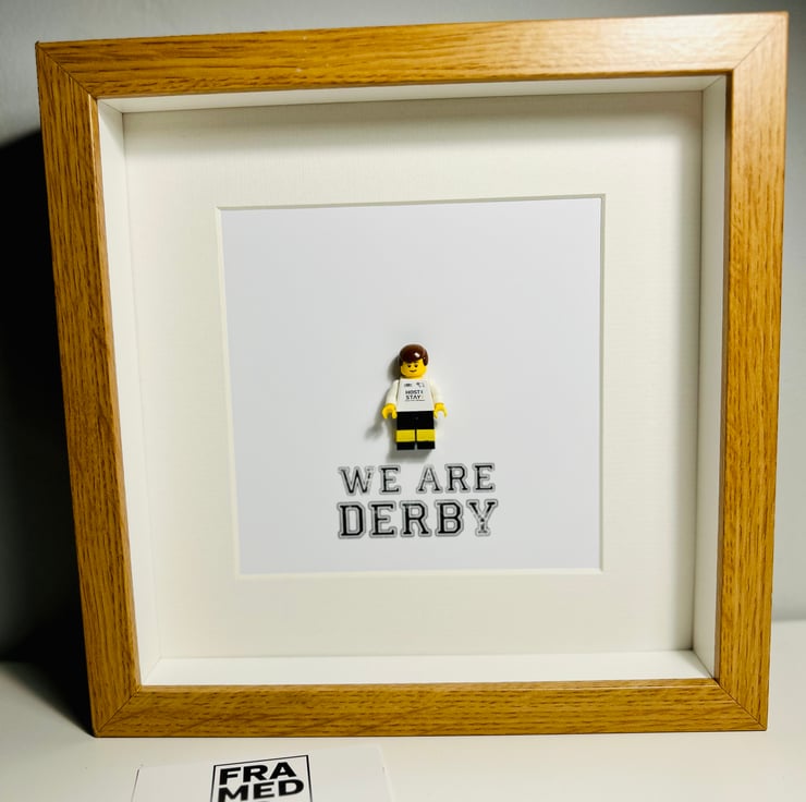 The deep box frame features and custom minifigure of a Derby County player - he comes complete with a replica shirt and the wording 'We love Derby'