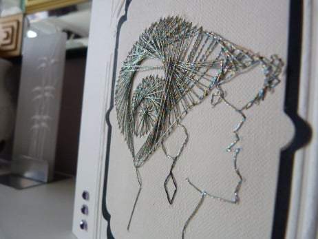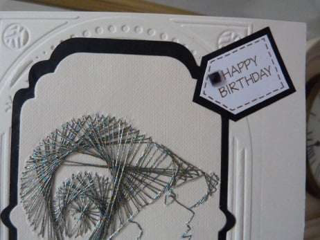 A completely hand made card consisting of quality cream card which has a design of cloche hat stitched using holograph silver thread. This has been mounted onto black card then onto cream card which has an art deco motif embossed. Finished off with black rhinestones and a happy birthday tag.