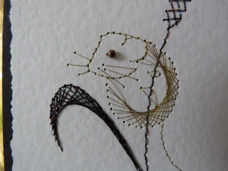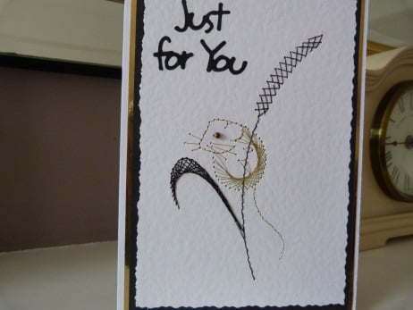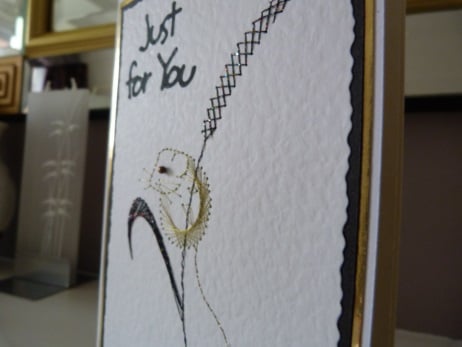 This is a completely handmade card consisting of quality white hammered card which has the cutest little harvest mouse stitched balancing on a stem of wheat. The mouse stitched in gold thread and the wheat in black holograph thread. Mounted onto black card, then gold mirri then quality pristine white card. Finished off with Just For You die cut from black card and a small gold bead for the eye.
