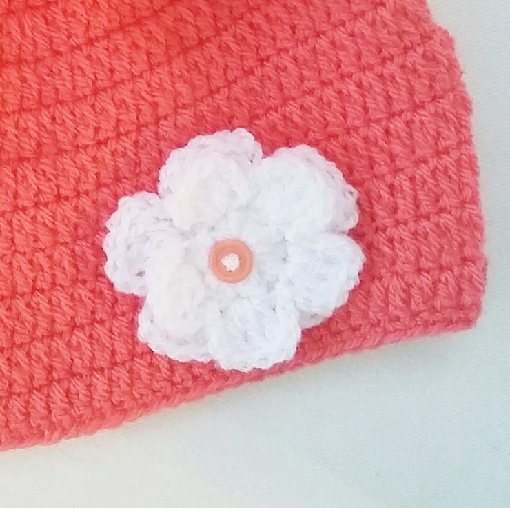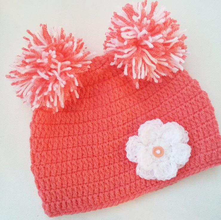A gorgeous coral and white double pom pom beanie style hat, with an added double layered white flower. Made in the beautiful coral colour to brighten up dreary days, or to go perfectly with the spring colours that will soon be popping up everywhere!