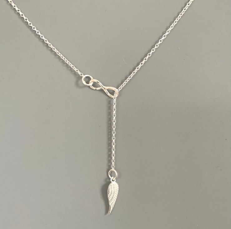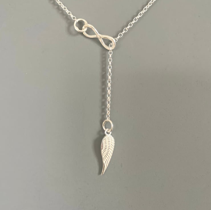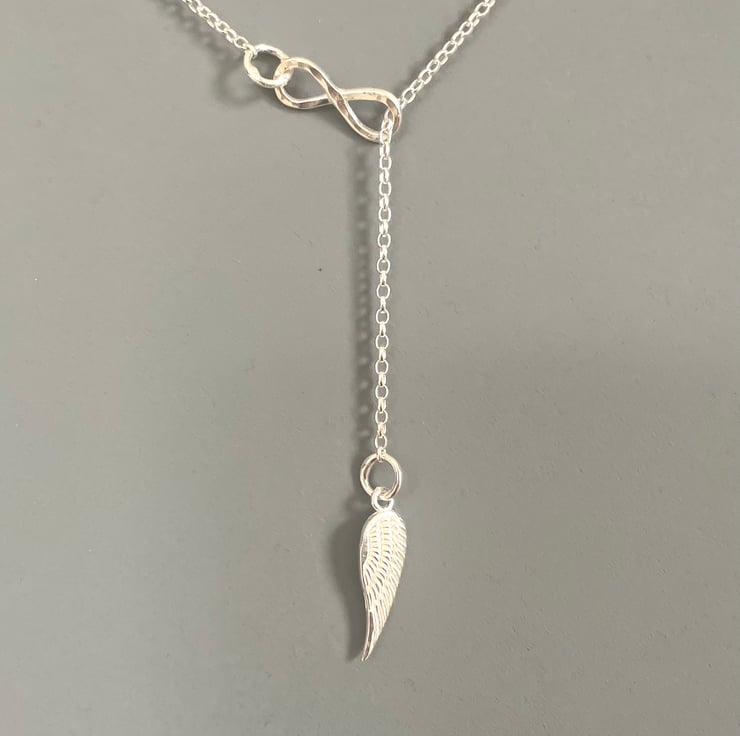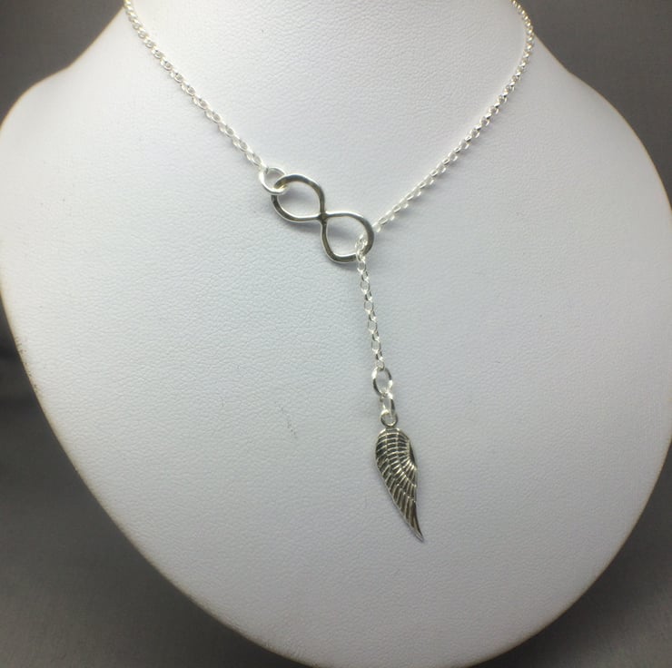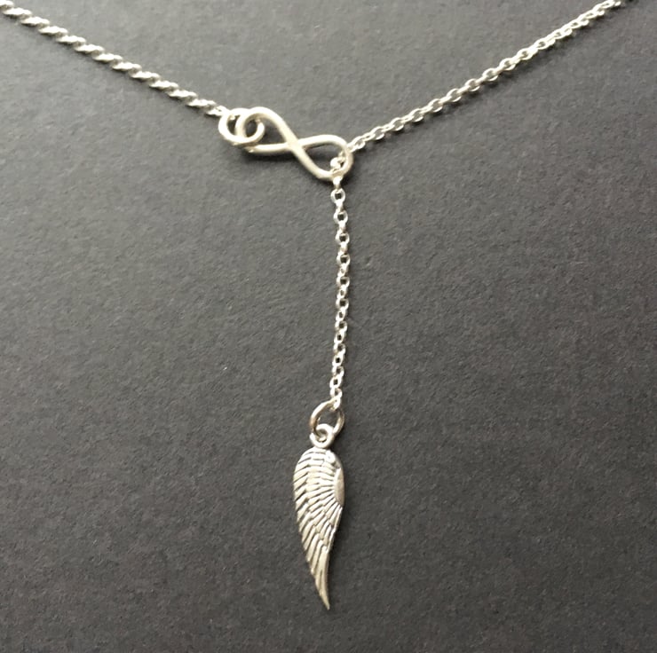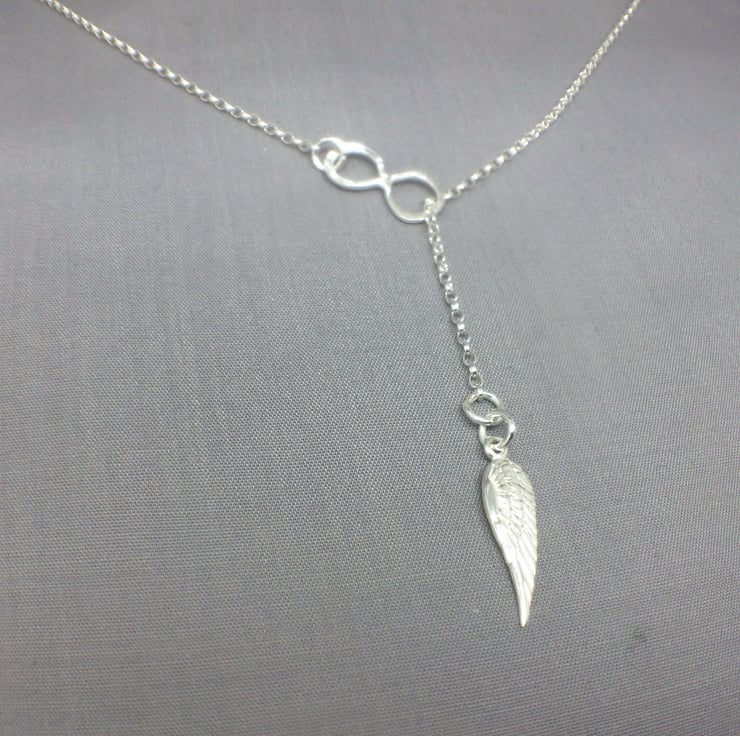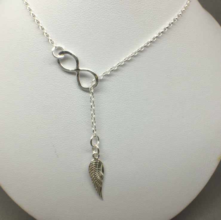 Lariat 'Y' Infinity Angel Wing Sterling Silver Necklace - I made this necklace with Sterling Silver. The Sterling Silver Infinity symbol was lightly textured and soldered to the Sterling Silver oval link chain. I attached the Sterling Silver Angel Wing charm and attached a Sterling Silver clasp.