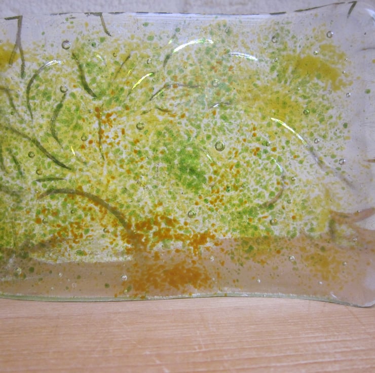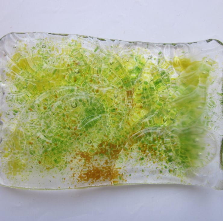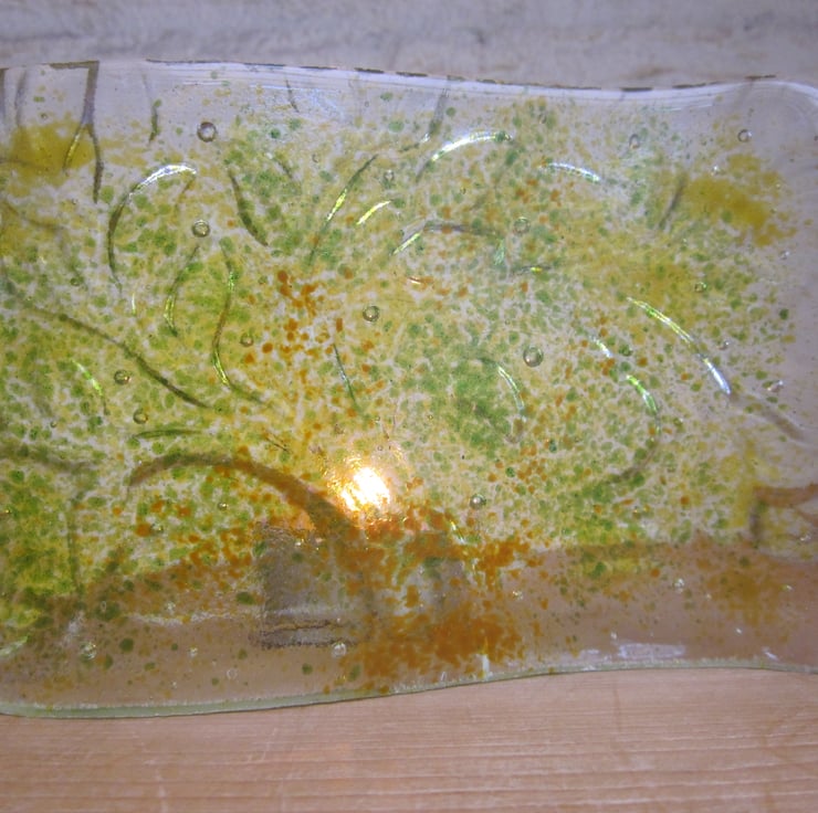 This glass candle or nightlight shade was fused by me in my studio. I layered green and amber glass frit and clear sheet glass over a textured shelf, then the glass was heated up to around 800 degrees Celsius to melting point in a small glass fusing kiln and it was then brought to annealing temperature to make it strong. It was then slumped over a wave shape. This whole process takes over 18 hours to complete.