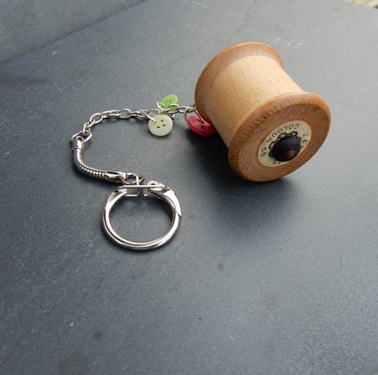 I love wood, and I had some cotton reels which were all used up, but felt I couldn't throw them away. I love sewing and am involved in costume making for our local amateur dramatics group. A keyring using one of them would be ideal to hold the keys to the costume store - everyone would know they were mine!