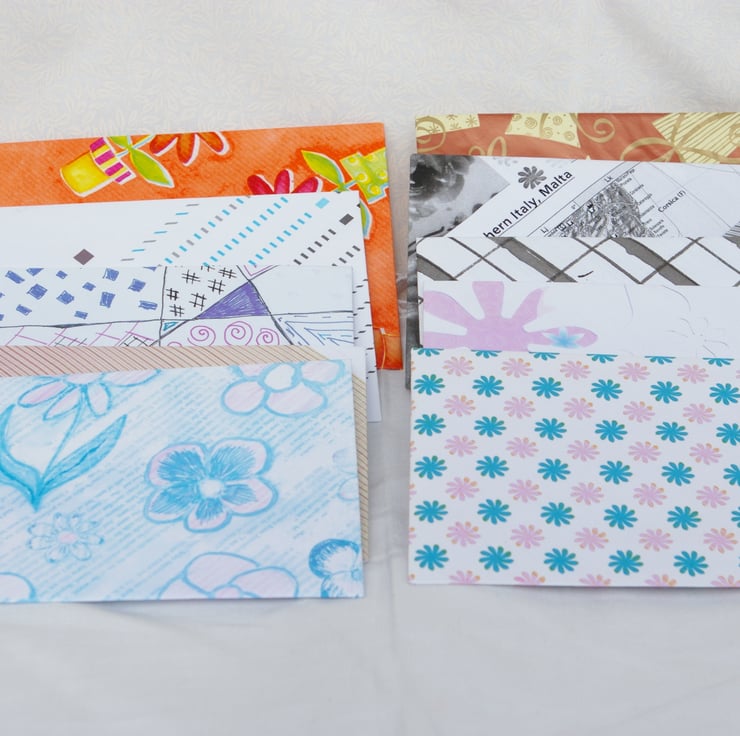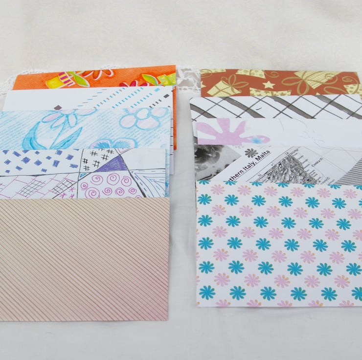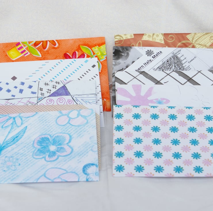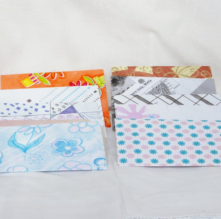 A group of ten handmade envelopes, in the same size but in different colours and pattern.