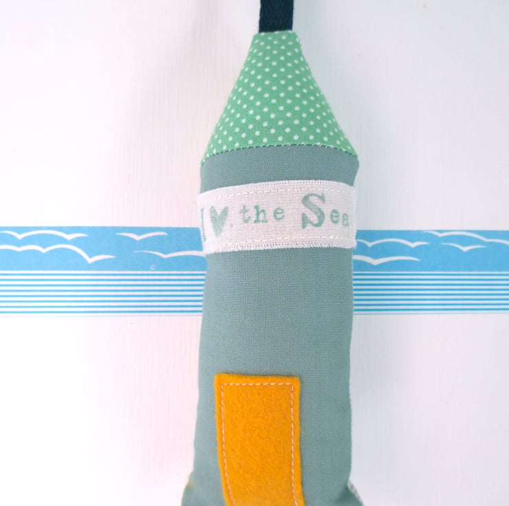 Stitched from cotton fabrics and felt, with a long cord for hanging onto door knobs or hooks.