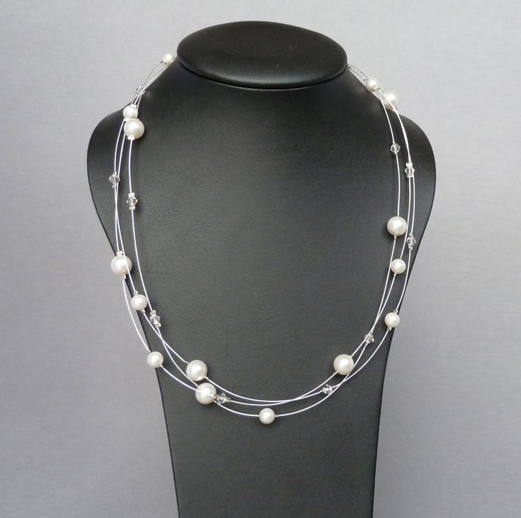 This white floating pearl jewellery set has been made using white glass pearls and sparkling crystals and includes 1 necklace, 1 bracelet and 1 pair of stud earrings. This three strand jewellery set would make the perfect gift for a bride or her bridesmaids.