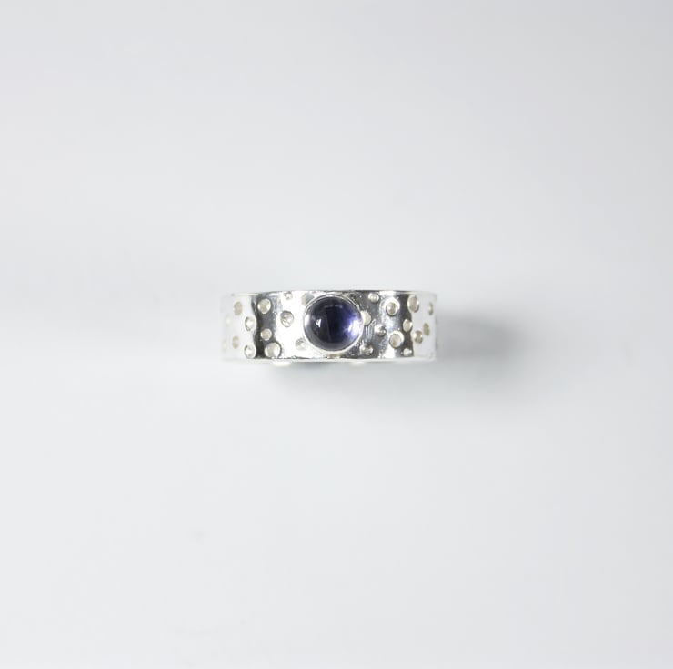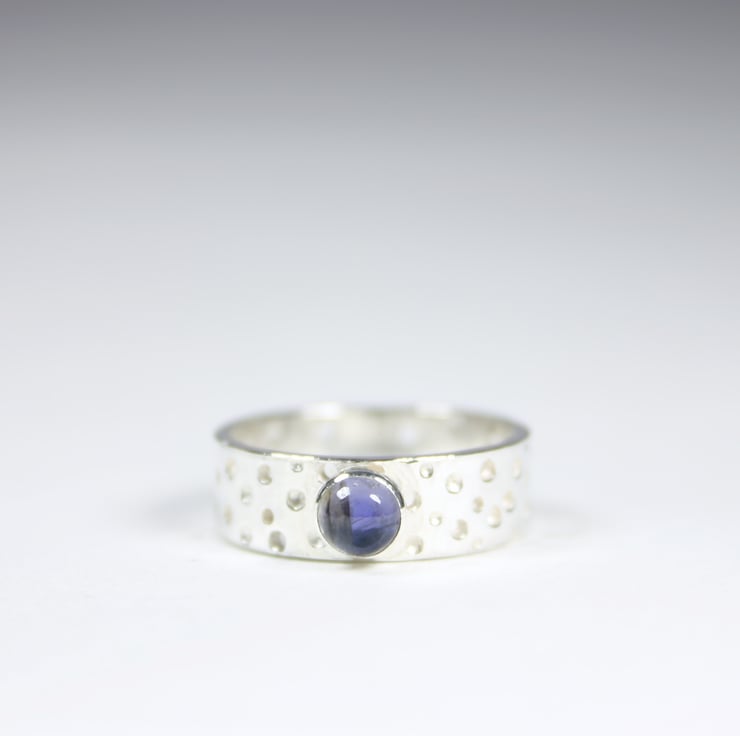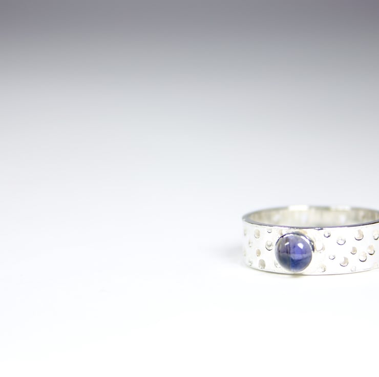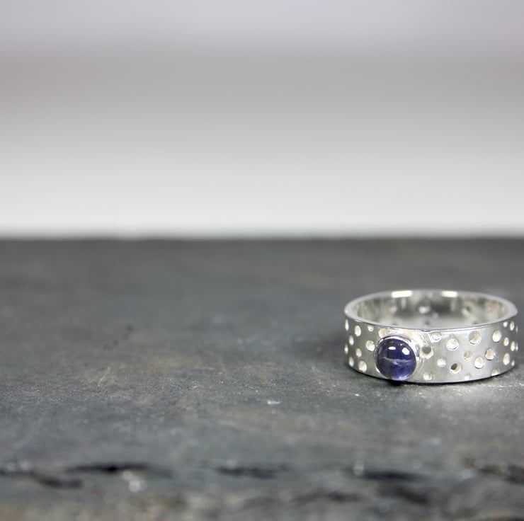 Handmade ring from 05mm wide 1mm thick silver sheet with a lacy/bubble pattern which is achieved by drilling different depth holes with different sized drill bits in a sporadic pattern Because of this method no two rings are the same. The ring is then finished off with a 5mm violet Iolite gemstone.
