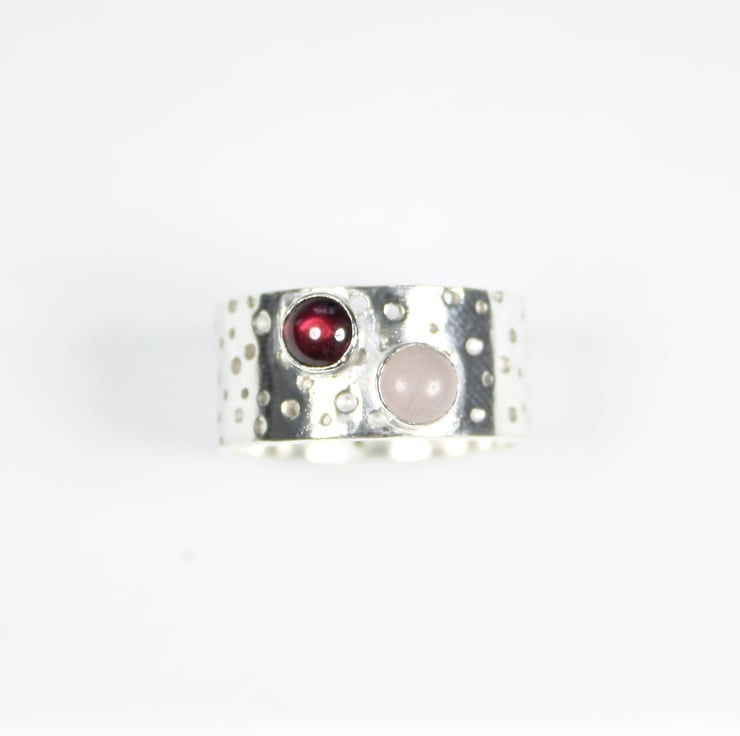 Sterling silver ring made from 1cm wide silver sheet with a bubbly pattern made by drilling different depth holes with different size drill bits in a sporadic fashion. Finished off with a 5mm rose quartz and 5mm garnet gemstone.