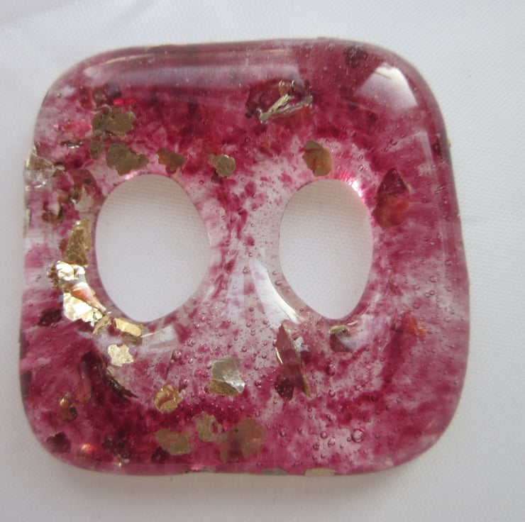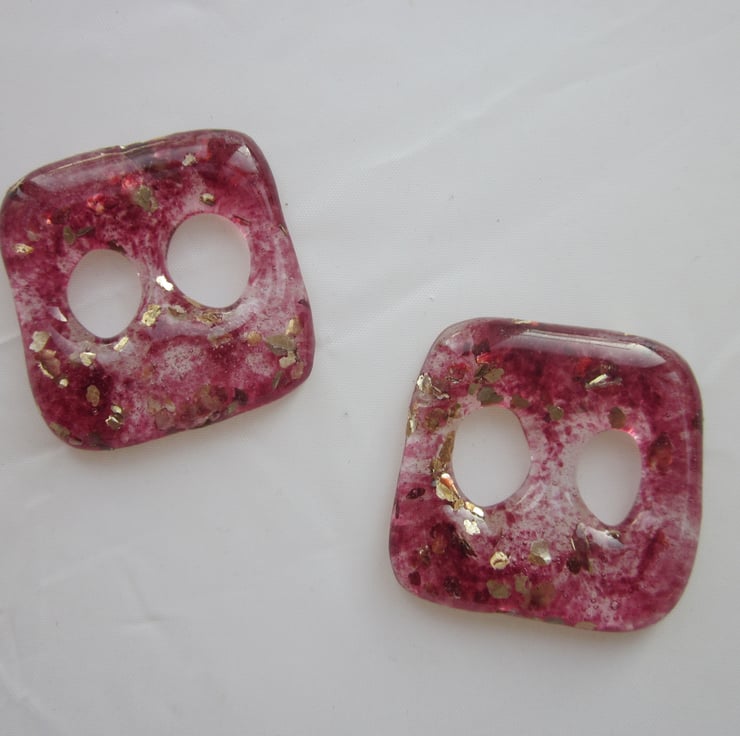 These buttons are a beautiful mottled dark pink with scattered gold mica glitter enclosed, and are glossy with surface mica creating occasional texture. They are approximately 4cm across. They will be perfect to fasten a bag or hand knit cardigan.