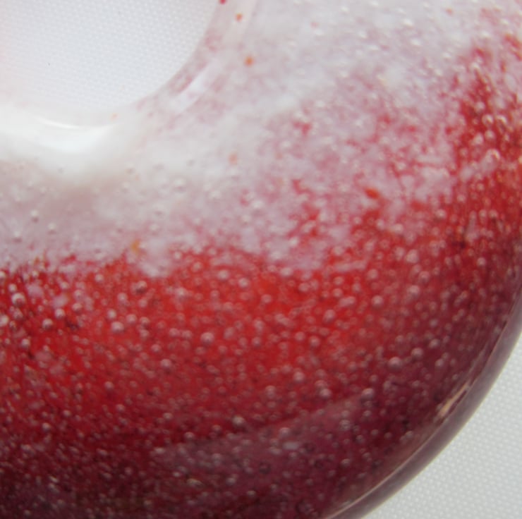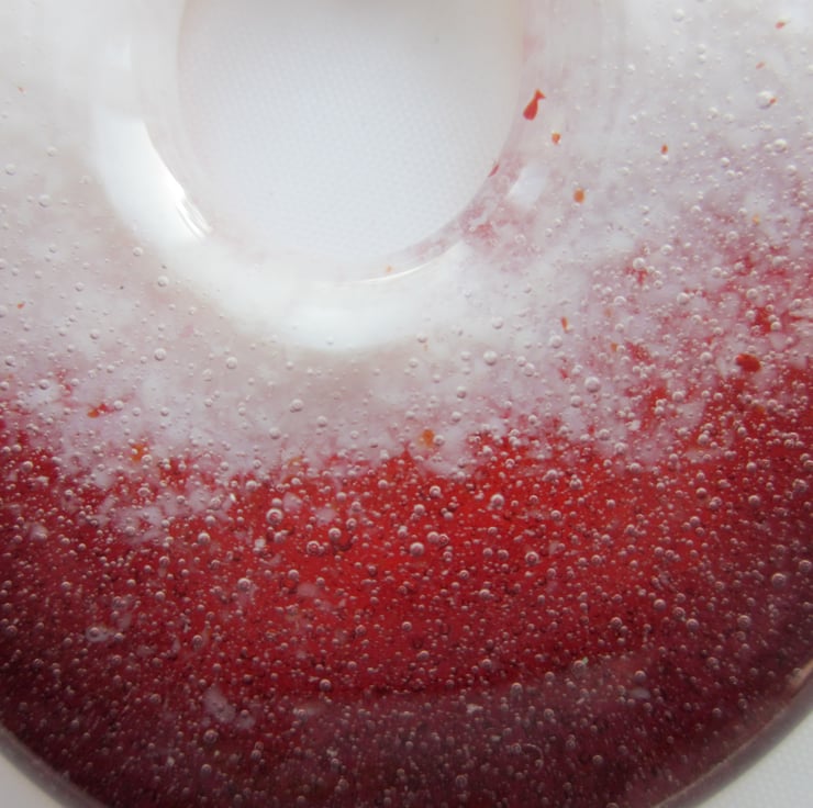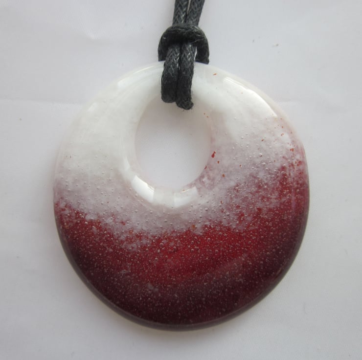 It is a stunning ornament, with dark red and scarlet transparent frit cast with pure white and encased in clear glass, like blood on ice. It is approximately 4.5cm round. A beautiful piece of statement jewellery and one of a kind. Ideal as a present to a loved one.