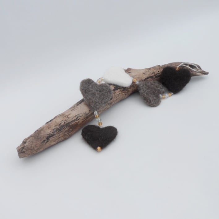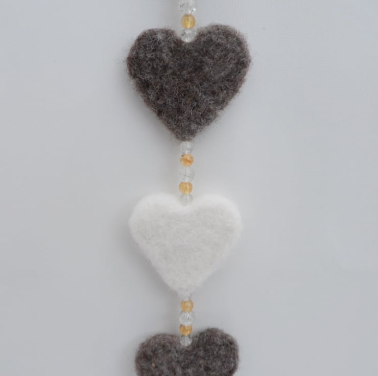 Needle felted using natural brown, dark brown and white wool fibres, these hearts have been interspersed with golden and clear glass crackle beads to create a lovely hanging decoration for any room. The hearts measure approximately 5cm (2") and the total length of the decoration including the cotton thread hanging loop is approximately 40cm (16")