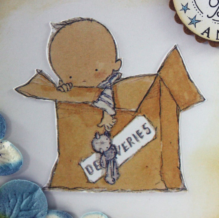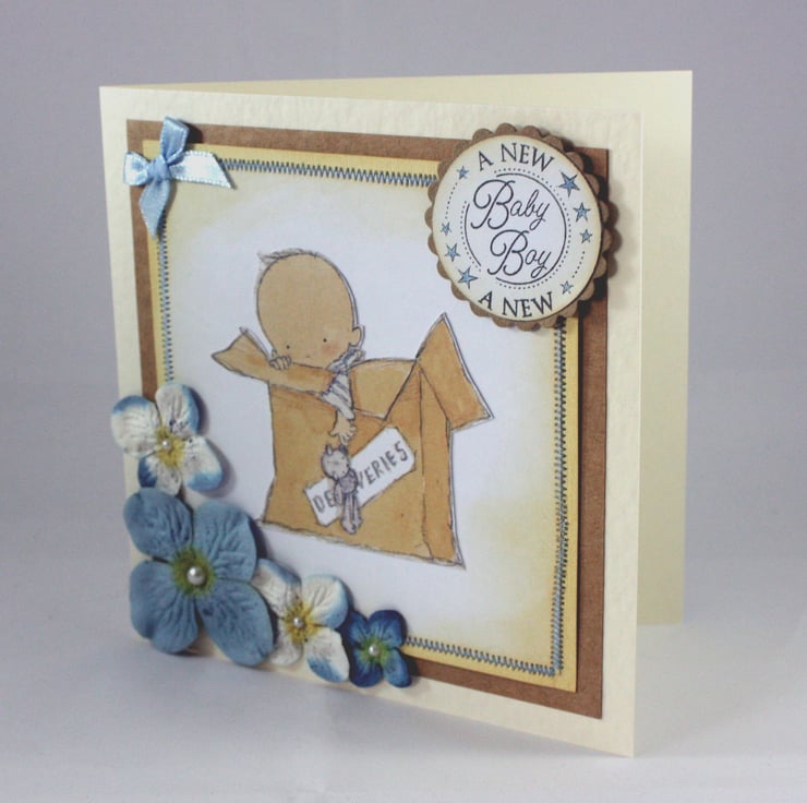 Square, new baby card with an image of a baby in a box on distressed and machine stitched card and layered onto kraft card. A stamped message reads: 'A new baby boy' and is also layered onto a die cut, scalloped circle of kraft card. The card has been embellished using paper hydrangea flowers with faux pearl centres and a blue satin ribbon bow.