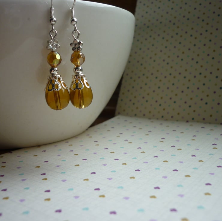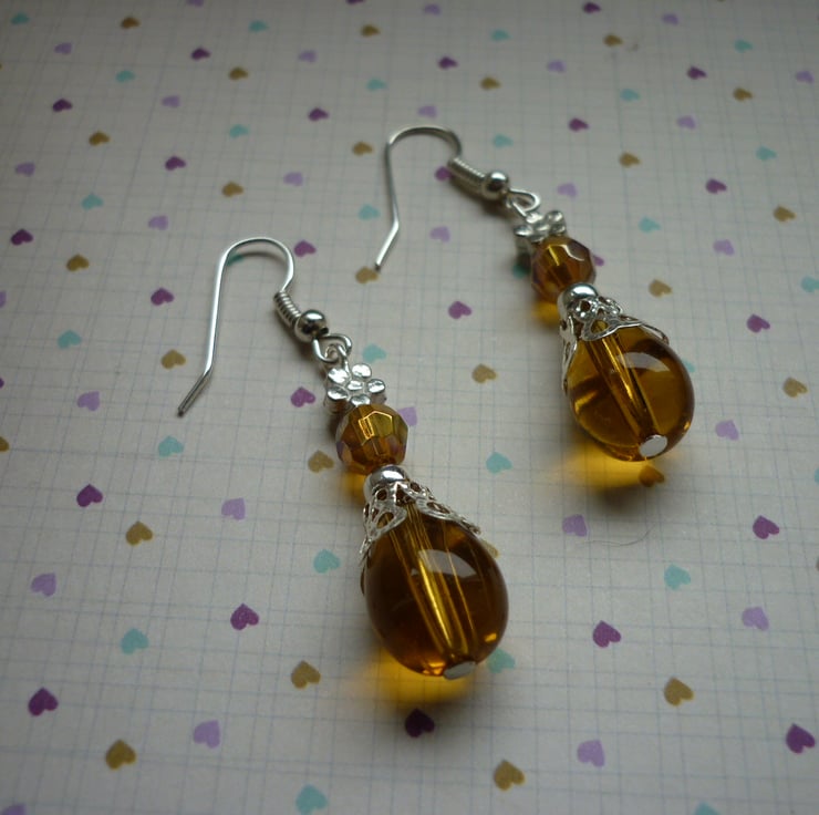 THE EARRINGS HAVE BEEN MADE USING A SINGLE PEAR TEAR DROP GLASS BEAD IN TOPAZ ALONG WITH A SINGLE FACETED TOPAZ BEAD, SILVER PLATED FANCY BEAD CAP, SMALL ROUND SILVER SPACER BEAD, DAISY SPACER BEADS AND FINISHED WITH SILVER PLATED FISH HOOK EAR WIRES.